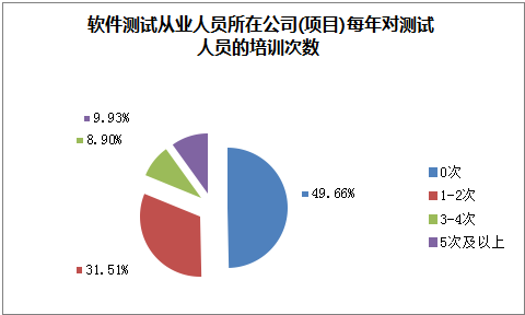 然而,在被調查者所在公司中,測試人員與開發人員的比例在1:4及以上的高達55.13%。在這些公司中,49.66%的公司每年對測試人員進行的培訓次數為0。也就是說,將近一半的軟件測試人員在工作后沒有進行培訓學習的機會,這就要求想從事軟件測試的人員在入職前培訓相關的技能,確保工作可以順利開展。